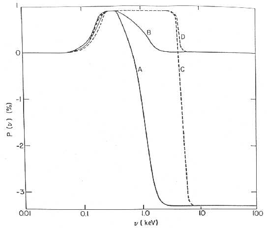 Figure 6: Net polarization of radiation from the CygX-1 accretion disk assuming an inclination of 41°; M= 10 solar masses, and dM/dt=7 × 10^17 g/s. The accretion disk parameters assumed for the different curves are given in Table 3. This figure comes from Lightman and Schapiro (1976).