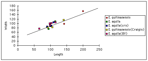Exogyra aquila is thought to be the oldest exogyra oyster and is found in the Cow Creek and Hensell formations in Central Texas. Exogyra quitmanensis is a very similar fossil of the same age found in the Quitman formation of West Texas. Upon examining the literature I found it quite difficult to see any differences between these two species. The E. quitmanensis are thought to be larger and have greater convexity. Upon examination of the fossils from the Cow Creek formation in the University of Texas Geological repository I found that all specimens were identified as E. quitmanensis, although this was never published, to my knowledge. To address the question of the differences between the two species I have collected data from as many sources in the literature as I could find and using specimens collected by myself and B. Yurke have made the following plots. One might conclude from the plots that these two species should really be joined into a single species. In that case, the name E. aquila should be reserved for the European species and E. quitmanensis for the Texas species. Final determination of this question should wait until additional specimens can be collected from the quitman formation.
