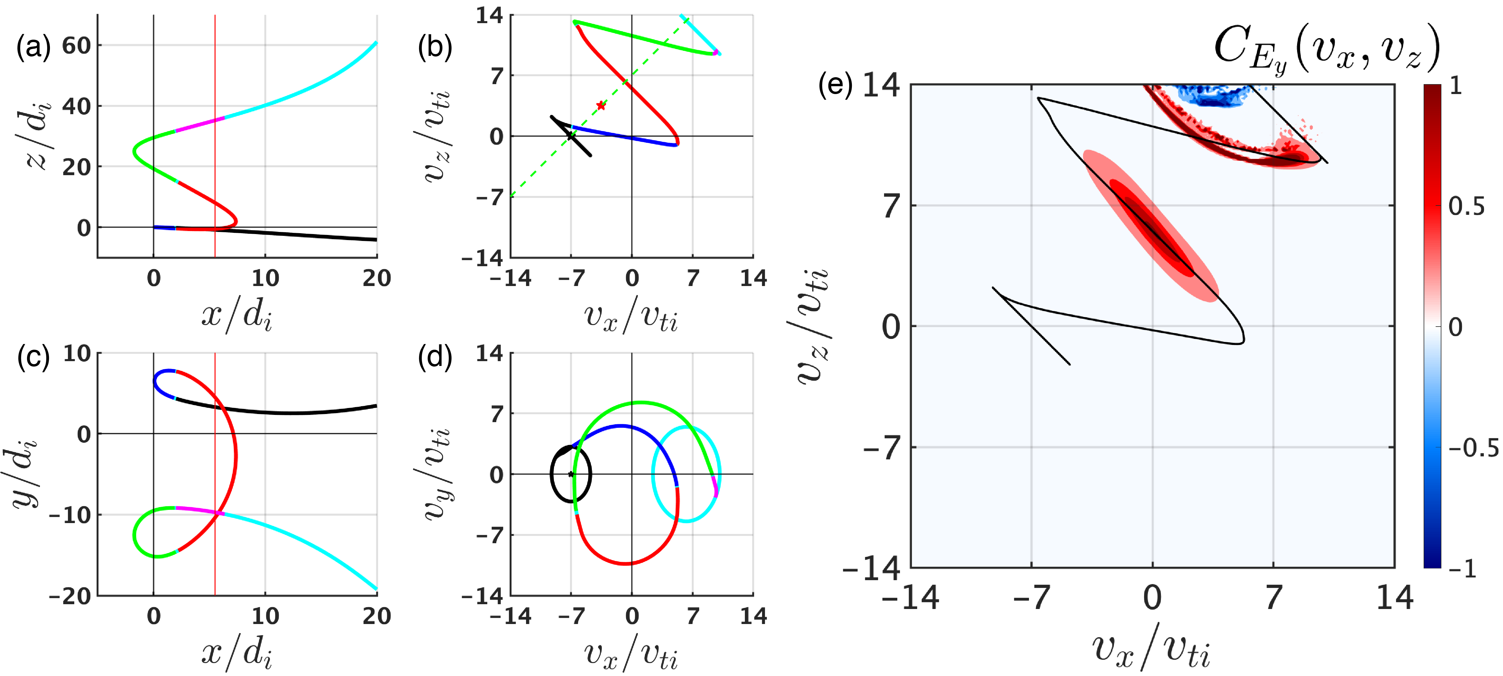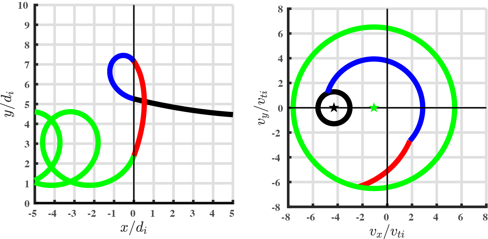 To intepret the features of the ion velocity distribution in velocity space, particulkarly the reflected ions that undergo the process of shock-drift acceleration, we plot below the trajectory of a typical reflected ion encountering a jump in the transverse magnetic field in (left) (x,y) space and (right) (vx,vy) space in the shock-rest frame of reference. Upon reflection at the shock front (due to the jump in transverse magnetic field Bz), the ion undergoes shock-drift acceleration by the motional electric field (Ey > 0) in the red segment of its trajectory, moving away from the origin of velocity space.