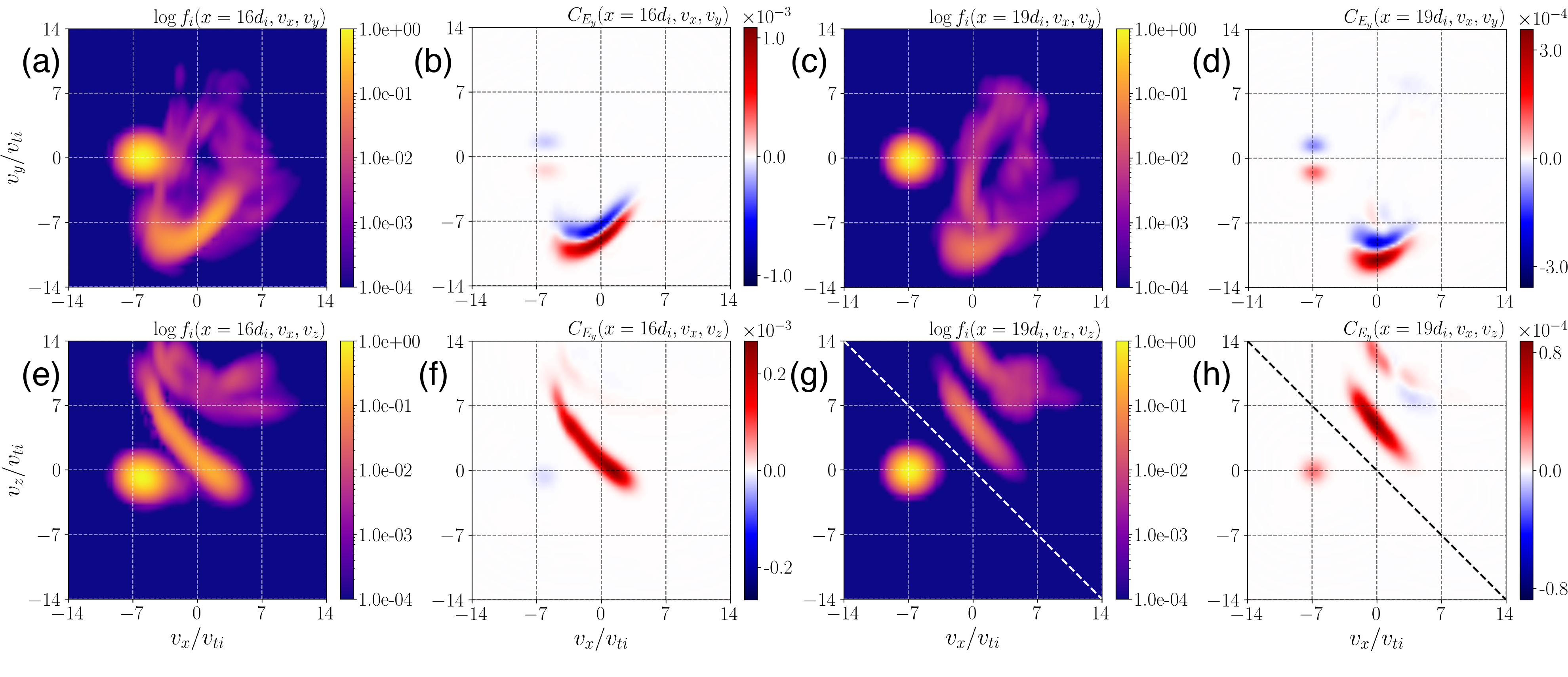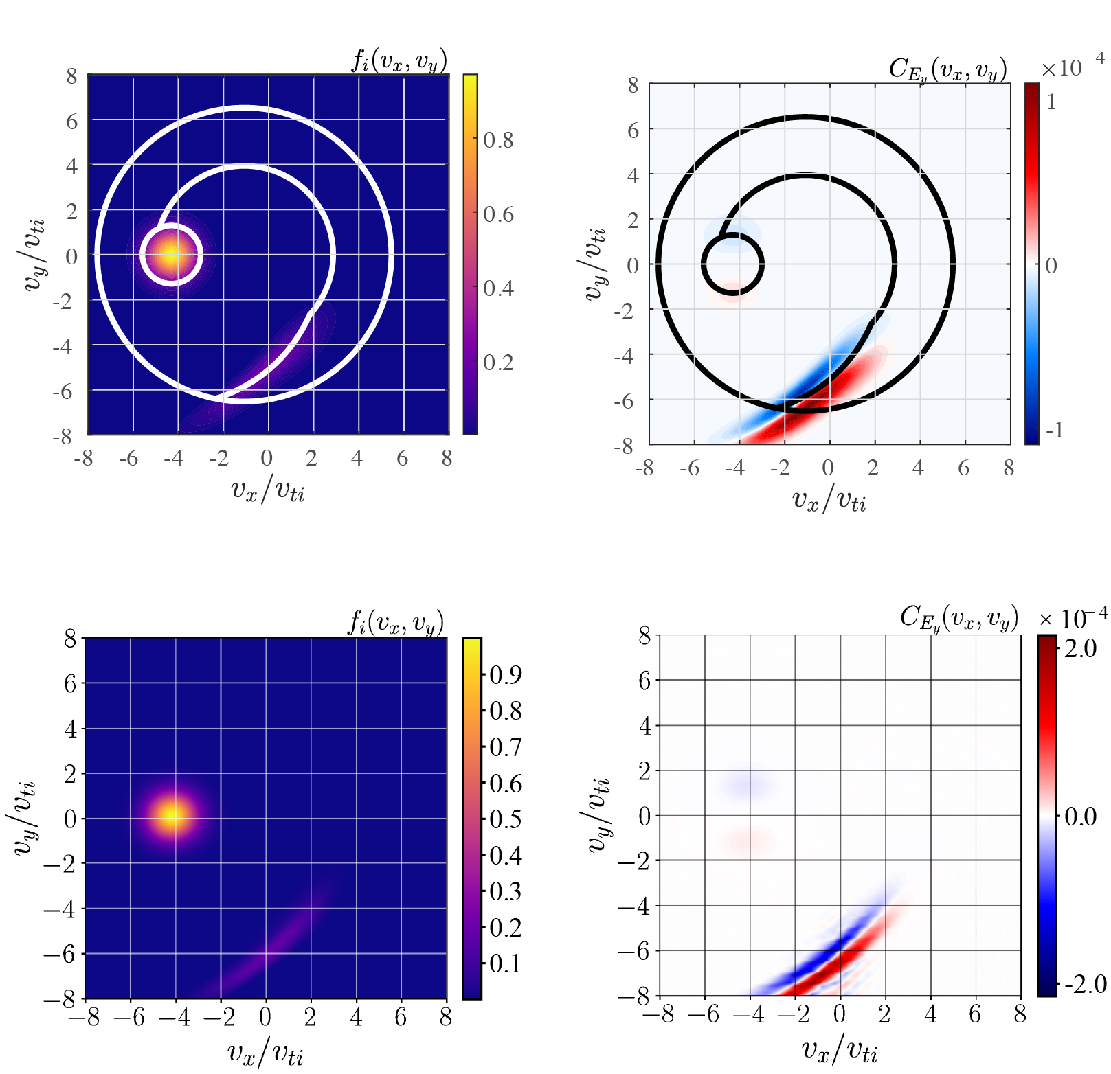 Together, these results illustrate the power of the continuum Vlasov representation of the physics using the Gkeyll solver, which provides essentially noise-free calculations of the ion velocity distribution (as well as the electron velocity distribution, not shown here but discussed in the paper) at each point in the physical(x,y) space of the domain. This capability is critical to apply the field-particle correlation technique to explore the ion energization at collisionless shocks.