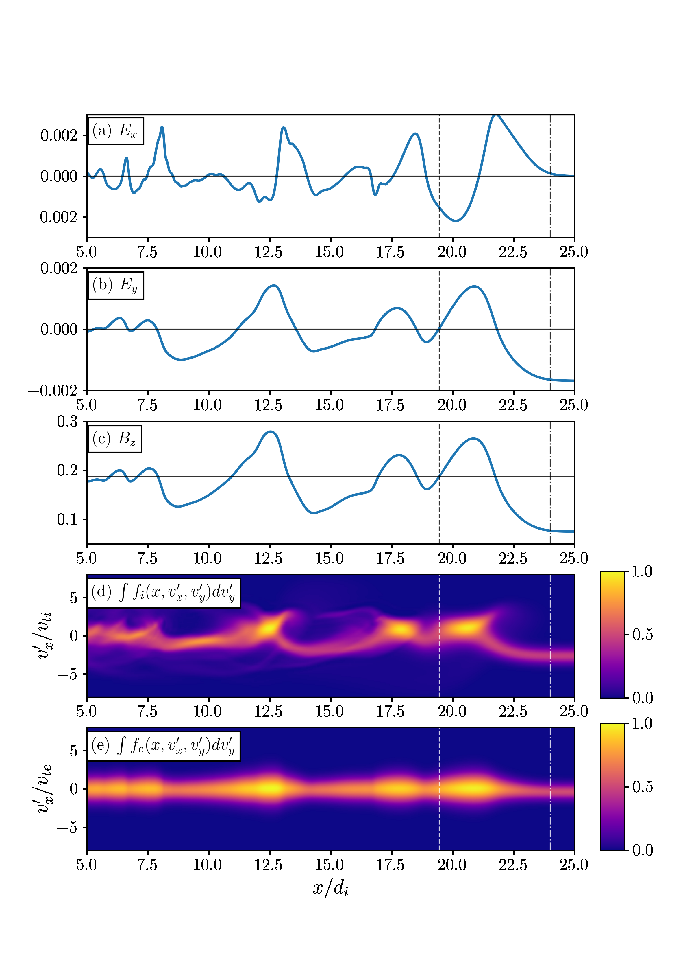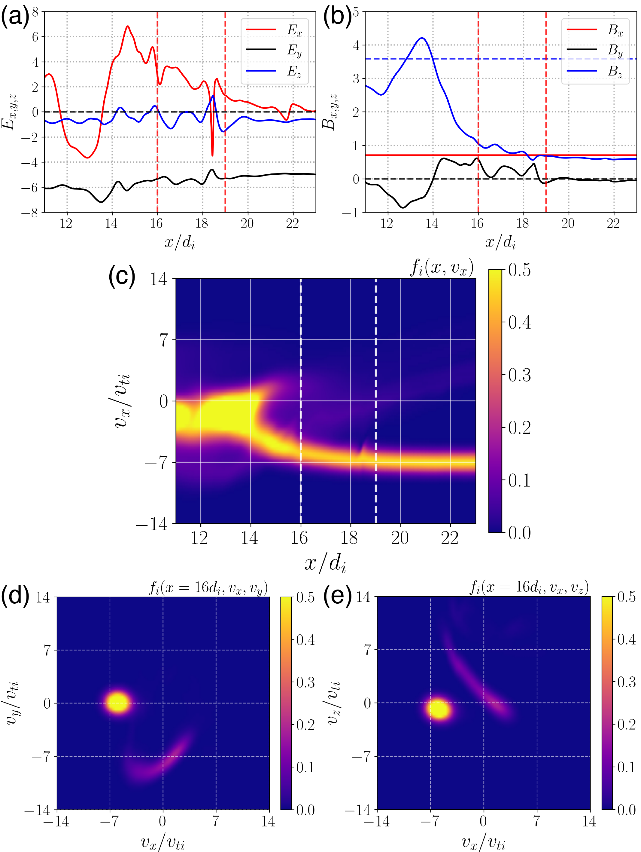 The shock transition is highlighted between the vertical dot-dashed line and dashed line, showing (c) the typical foot-ramp-overshoot structure in the transverse magnetic field Bz. One can see in panel (d) the reflected ion component with v'x > 0 at around x/di ~ 21.5.